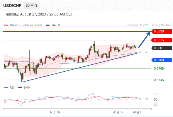 在 0.8780 之上,看涨,目标价位为 0.8815 ,然后为 0.8830 。