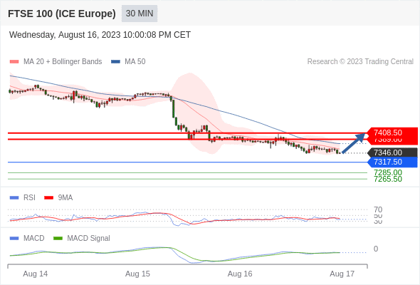 RSI技术指标小于中性区域50。 MACD技术指标呈现看跌状态并 处在其信号线的上方。 此外,价位低于其20个时期及50个时期移动平均线 ( 分别位于 7358.78 和 7375.58 )。