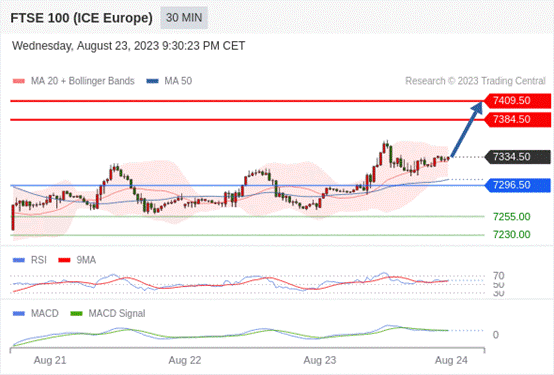 RSI技术指标超过50。 MACD技术指标处在其信号线之下 看多。 此外,价位高于其20个时期及50个时期移动平均线 ( 分别位于 7328.45 和 7304.47 )。