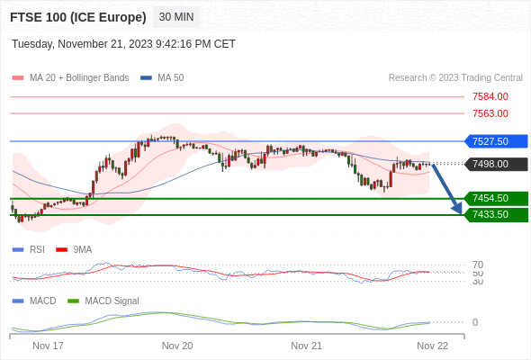 英国富时100指数期货 当日内: 在进一步下跌之前,反弹至 7527.50 附近。