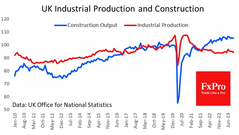 FxPro高级分析师Alex Kuptsikevich指出:这是工业生产和建筑业的警钟,它们被视为是商业周期的领先指标。工业生产指数在10月份立即下降了0.8%(预期为-0.1%),名义指数从去年最后一个季度回落到接近平稳水平。工业产值仅比疫情后的低点高出0.6%。如果我们排除疫情封锁期,英国工业生产上一次出现如此低的水平是在2017年。