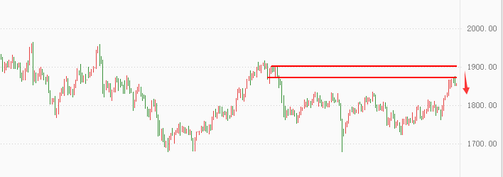 行情大概就是这样了。前面波动都不算特别大,上升空间走了一个极限空间。对于这个极限高点个人是比较无奈的。毕竟前期走上升的时候,也没有走出极限高点。今天周三大涨的可能性更小,多头昨天假突破回落,其实昨天盘中走势多头已经失去优势,但最终还是让它先涨了一波。在晚盘尾盘时间盘果然还是回落下来。断断续续的上涨不如直接狂躁的下跌,这里并不能说价格受阻回落,我说过行情现在走回撤是为后面的多头做准备,那就只是震荡修正而已,昨天的假向上突破也会导致后面还要继续测试这个高点,所以后面做多的需要更多的耐心。那么明确今天突破的可能性更小,那么周高点就是在1875附近,低点是1828-25,本周最终锁定这个区域,有50美金左右的空间够用了,原则上今天仍然高空为主,反弹做空,回落继续低多,然后看25号高点。