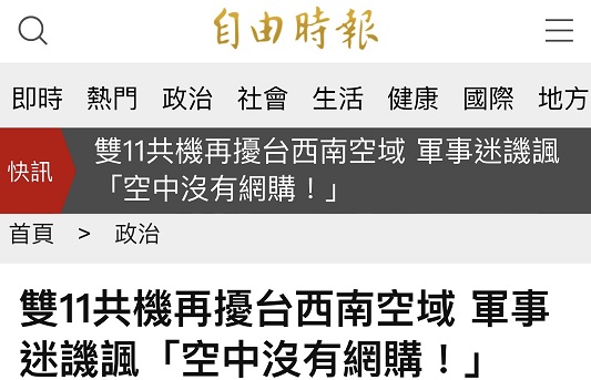 根据台湾媒体《自由时报》周三(11月11日)最新报道,解放军军机“袭扰”西南空域频繁,今天一早7时许再次进入台西南空域,台空军照例广播驱离,本月累计进入台空域9天。 根据广播记录,解放军军机从7时48分进入台湾西南空域,高度2900米,台空军在空警戒、并广播驱离,内容为“位于台湾西南空域高度2900米的大陆军机注