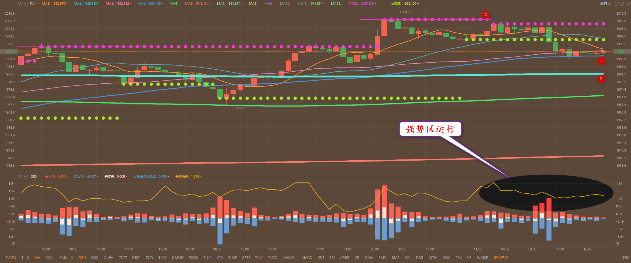 通过对黄金小时图解析得知,昨日行情还如期震荡调整运行在高位多头主力部分资金完成盈利减仓动作,晚间到达下方1号均线的支撑位,目前有所减缓下跌动作,我们从下方的幅图可以清楚地看到多头主力资金一直是在强势区运行说明目前属于多头主力的洗盘动作非常有可能的进一步上行突破,但是不排除进一步的回落调整到达下方2号均线的支撑位,短期上方我们继续关注3号压力位,短期在操作上我们继续高空低多思路,具体建议如下: