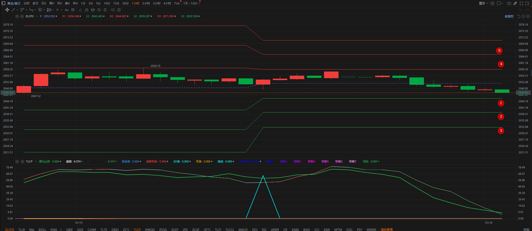 通过对黄金小时图解析得知,黄金从早盘到目前为止小幅回落,短期有进一步回落迹象,我们重点关注下方123号的支撑即可,目前短期下方附图还没有出现回调买入信号,我们到下方支撑位参与即可,短期上方我们继续重点关注45号的压力重点是5号的压力,短期在操作上我们继续高空低多思路,具体建议如下: