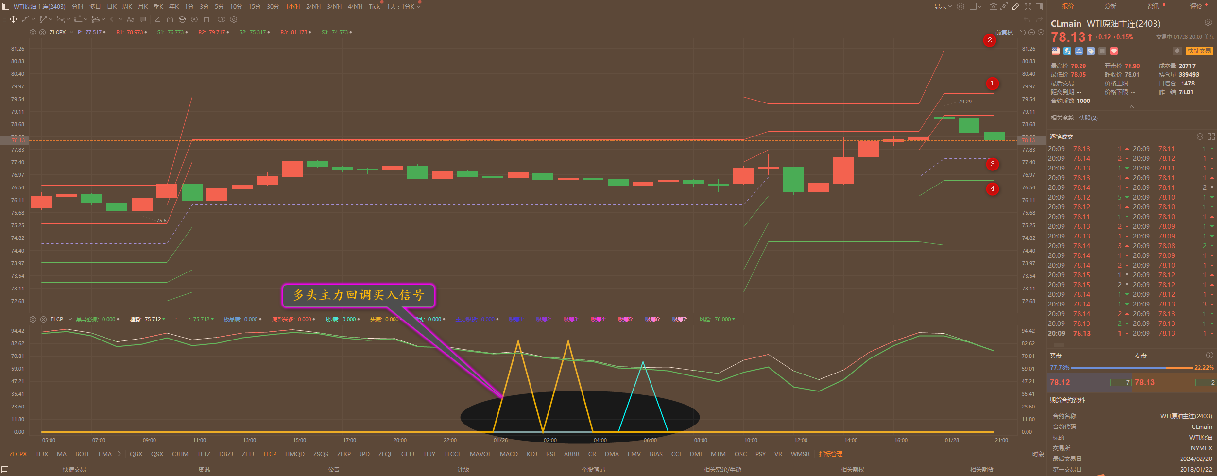 通过对原油小时图解析得知,上一个交易日先跌后涨,晚间再次突破创新高今日早盘受中东那边数据影响跳空高开目前有所回落,我们从下方的附图可以清楚的看到在上周五晚间多头主力在76.60一线出现回调买入信号,早盘在上方79.30一线受阻回落,目前依然回落调整中,短期已经突破并且脱离底部区域,短期上方我们重点关注12号的压力,下方我们继续重点关注34号的支撑,短期在操作上我们继续重点逢低做多,具体建议如下: