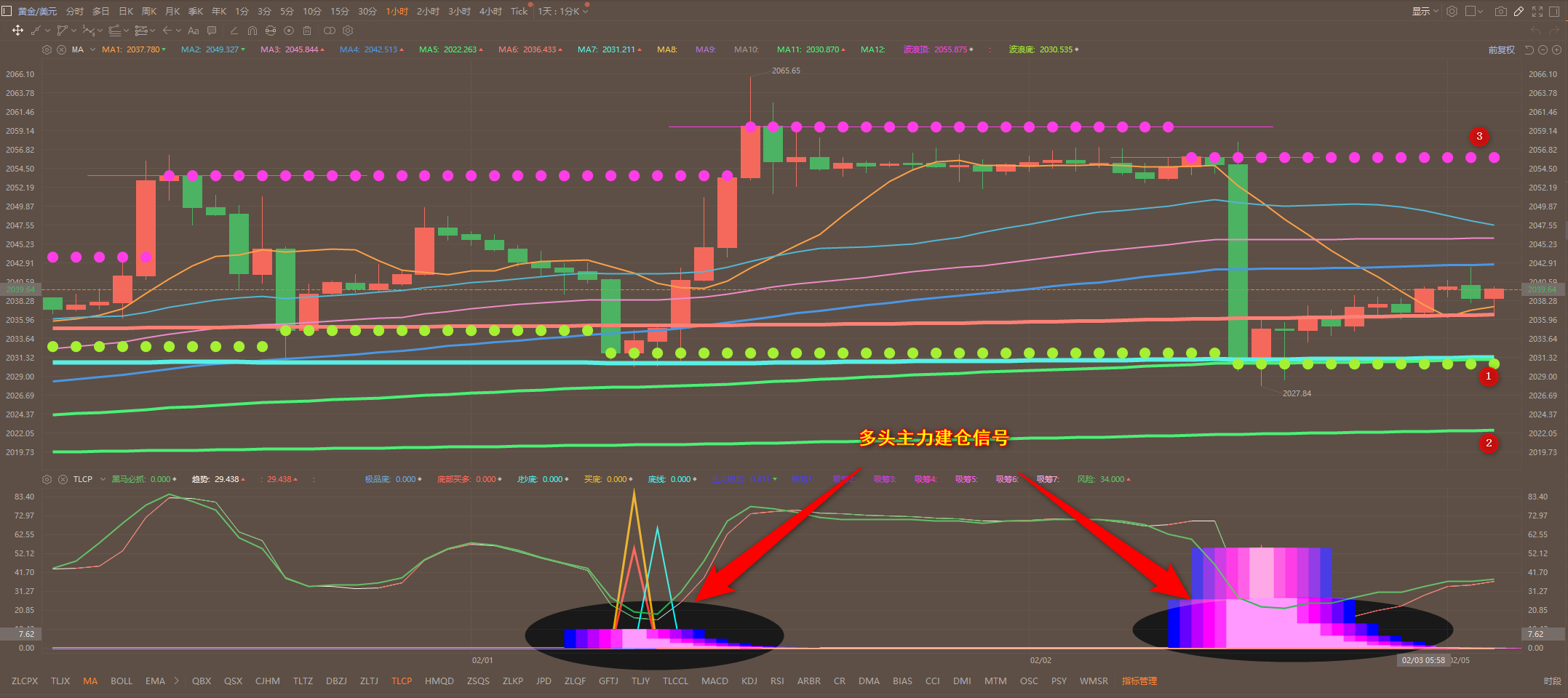 通过对优惠价小时图解析得知,上一个交易日如期先涨后跌晚间到达下方2028一线止跌反弹,目前依然反弹过程中,行情之所以会反弹我们从下方的附图可以清楚的看到上周五再次到达下方前期的多头主力的建仓区域多头主力再次建仓介入说明短期多头主力的意愿非常的强烈,上方我们重点关注3号压力位(2055一线)以及上方2065一线的压制,但是也不会排除进一步回落调整到下方12号的均线支撑,小妹个人认为继续向上震荡上行的可能性更大一点,短期在操作上我们继续高空低多思路,重点逢低做多,具体建议如下: