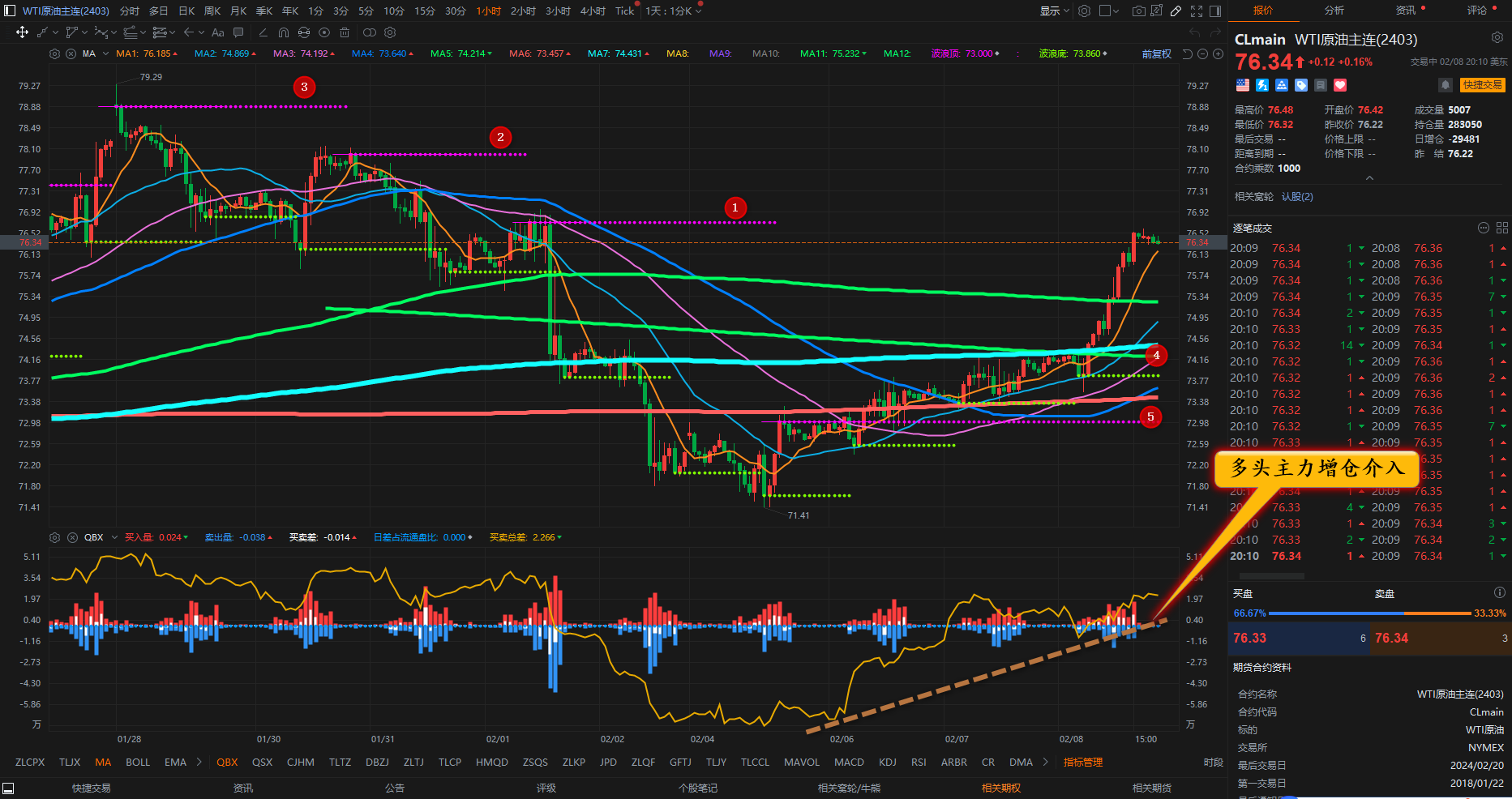 通过对原油小时图解析得知,昨日行情先跌后涨晚间一度到达上方1号压力位,相对而言得有一些压制,从近期见底以来后期一路反弹震荡上行,我们从下方的附图可以清楚的看到在底部区域大量的介入,说明多头主力的意愿非常的强烈,昨日出现了加速上涨动作目前即将到达前期的反弹高点的位置,理论上得要回调一波,但是也不排除冲高回落,短期下方我们重点关注4,5号的均线支撑,短期上方我们重点关注1,2,3号的压制即可,短期在操作上我们继续高空低多思路,具体建议如下:
