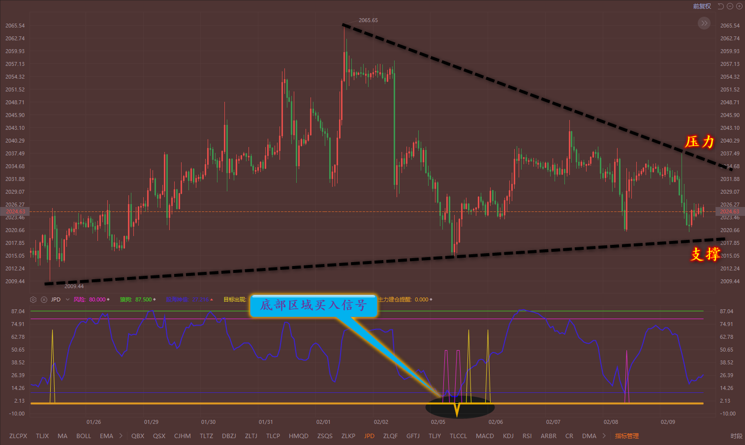 通过对黄金小时图解析得知,上一个交易日盘中先涨后跌继续延续下跌回落走势晚间再次到达下方2020一线,我们从近期的整体走势来看呈现楔形整理走势调整的空间越来越小,下方继续依托上升趋势线的支撑震荡上行,上方依然受制于下降趋势线的压制,我们从下方的附图可以清楚的看到在近期回落的低点位置出现了底部区域多头主力建仓信号,相对而言多头主力已经形成防守动作,预计近几日将会继续震荡筑底向上运行的可能性比较大一点,短期在操作上我们继续高空低多思路,重点逢低做多,具体建议如下: