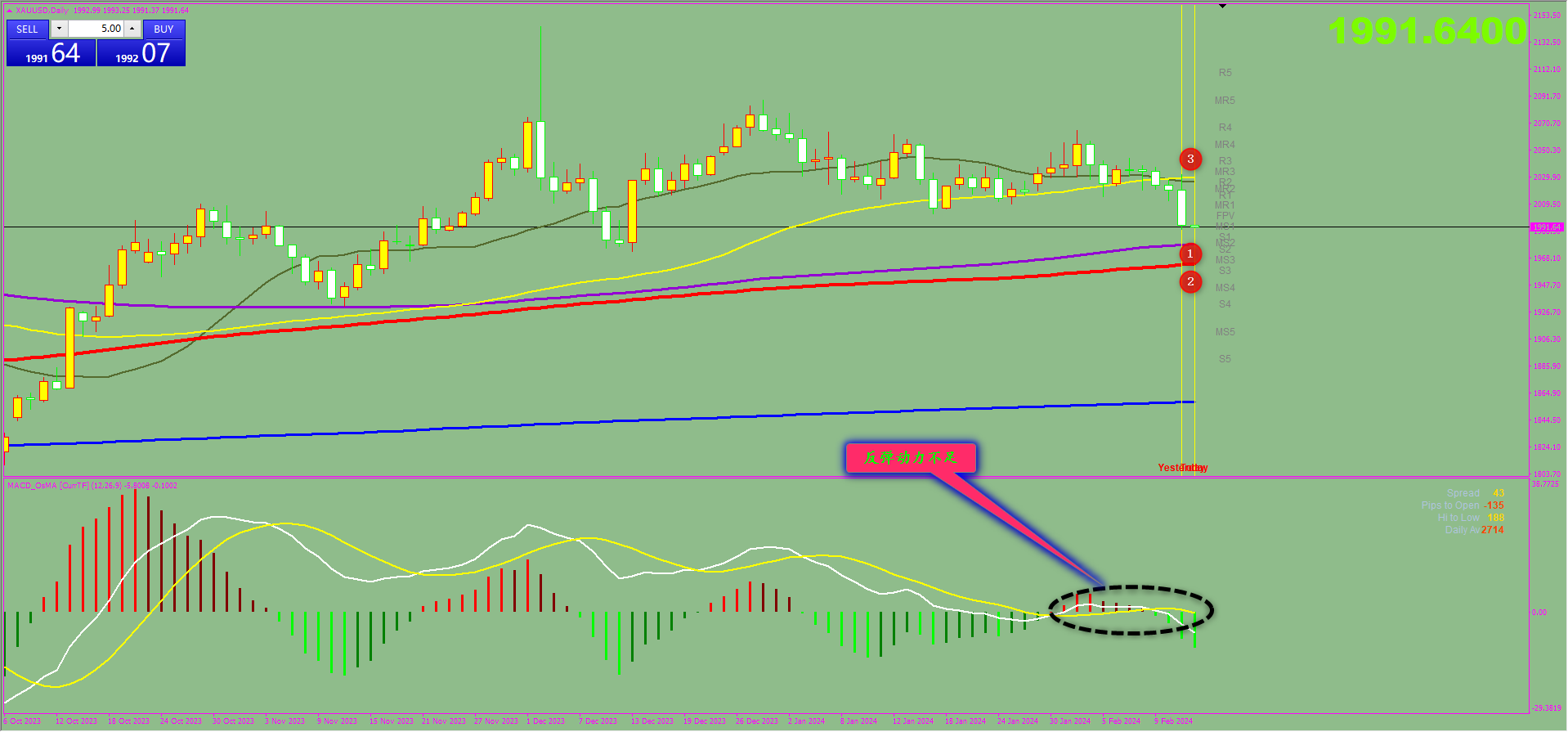 通过对黄金日线图解析得知,昨日行情如期冲高回落在上方60日均线受阻(3号线),我们从下方的MACD可以清楚的看到行情在反弹的过程中多头主力的动能明显不足,并且下跌动能有所增加,短期我们重点关注下方1,2号均线的支撑毕竟下方中长期均线系统依然向上运行相对而言有一定的支撑作用,短期在操作上我们暂且线逢高做空思路,具体建议如下: