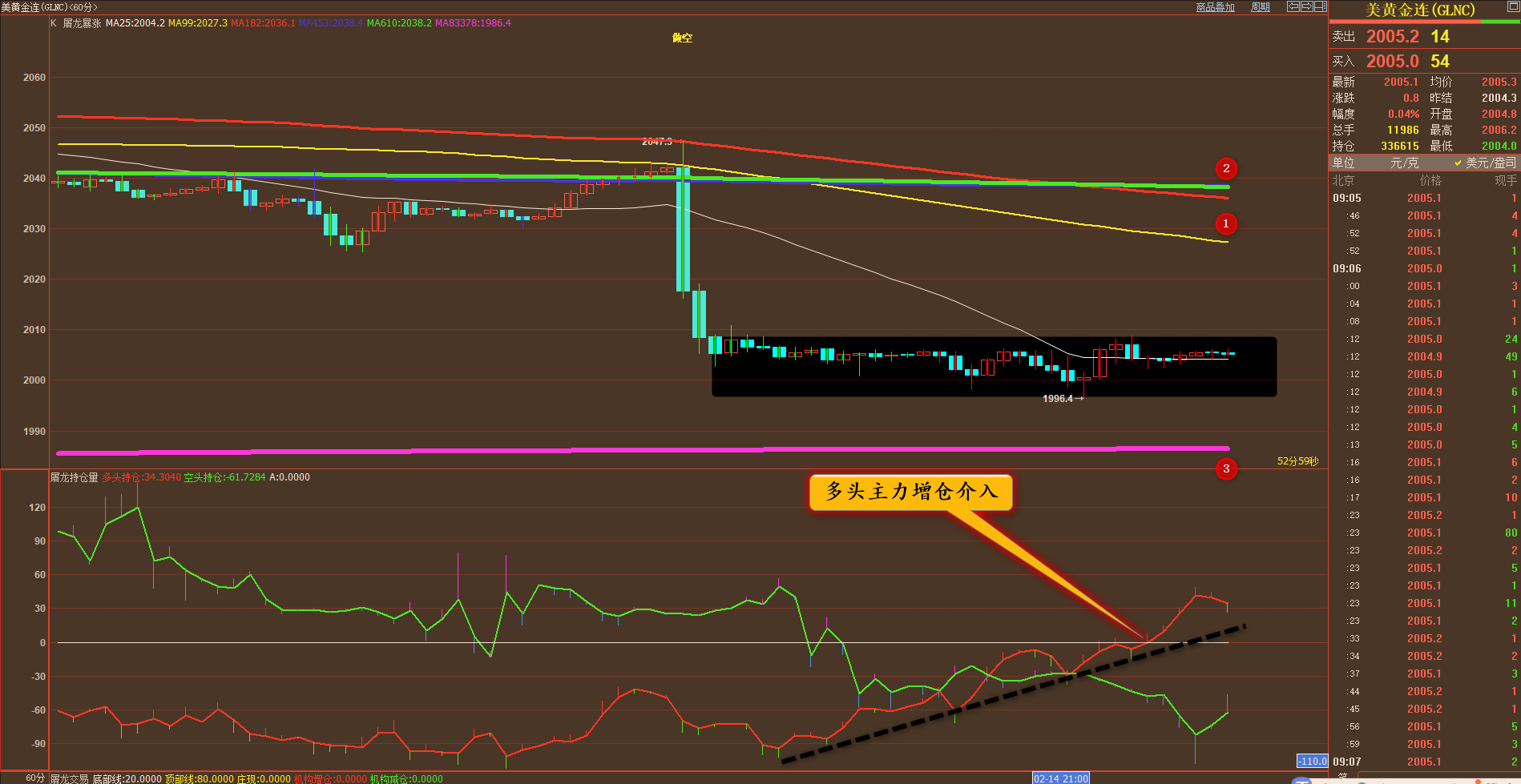 通过对黄金小时图解析得知,昨日行情继续呈现弱势盘整状态虽然晚间有下探动作,但是我们从下方的幅图可以清楚的看到行情在弱势横盘期间多头主力不断的大量增仓介入,说明行情即将要大幅反弹一波,短期上方我们重点关注上方1,2号均线的压力,但是也不排除意外受到数据利空影响到达下方3号均线支撑位,短期在操作上我们继续高空低多思路,具体建议如下: