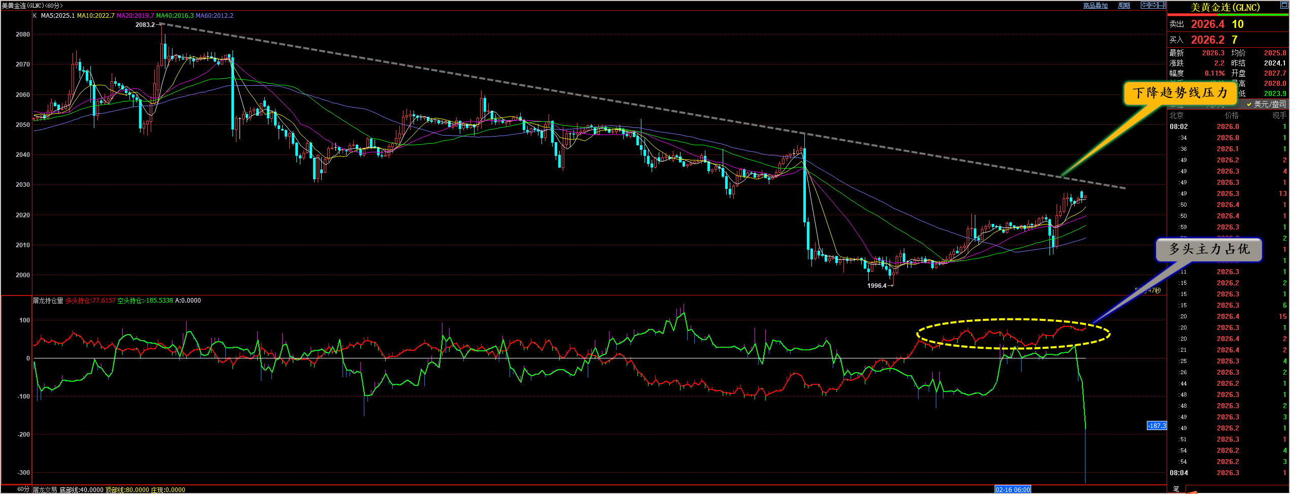通过对黄金小时图解析得知,上一个交易日黄金先跌后涨继续延续反弹走势,我们从下方的附图可以清楚的看到多头主力依然占优并且有小幅增仓动作,但是顺丰依然受制于下降趋势线的压制,目前还不能构成反转,短期继续震荡调整的可能性比较大一点主力继续以时间换空间的可能性更大一点,短期上方我们重点关注2019和2033一线的压制,下方我们重点关注1998和1984一线的支撑,在操作上我们继续高空低多思路具体建议如下: