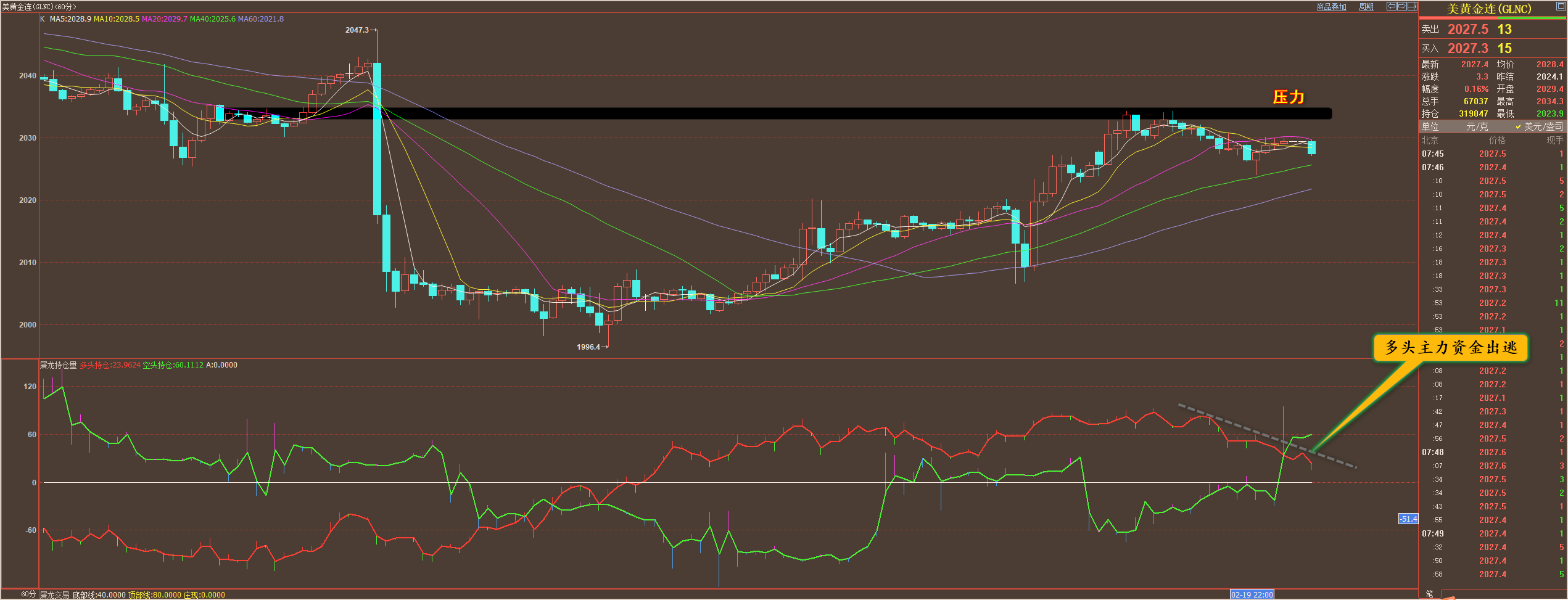 通过对黄金小时图解析得知,昨日行情先涨后跌,整体继续延续反弹走势,在上方2022一线受阻回落,我们从下方的附图可以清楚的看到昨日晚间多头主力选择了获利了结动作,到达下方2013一线在反弹的过程中多头主力依然是呈现出逃迹象,并且空头主力的查出来已经开始大于多头主力的查出来预计短期的附图即将结束继续回归下方的震荡区间,短期下方我们重点关注1994和1984一线的支撑即可其次是2008一线的支撑,短期在操作上我们继续高空低多思路,具体建议如下: