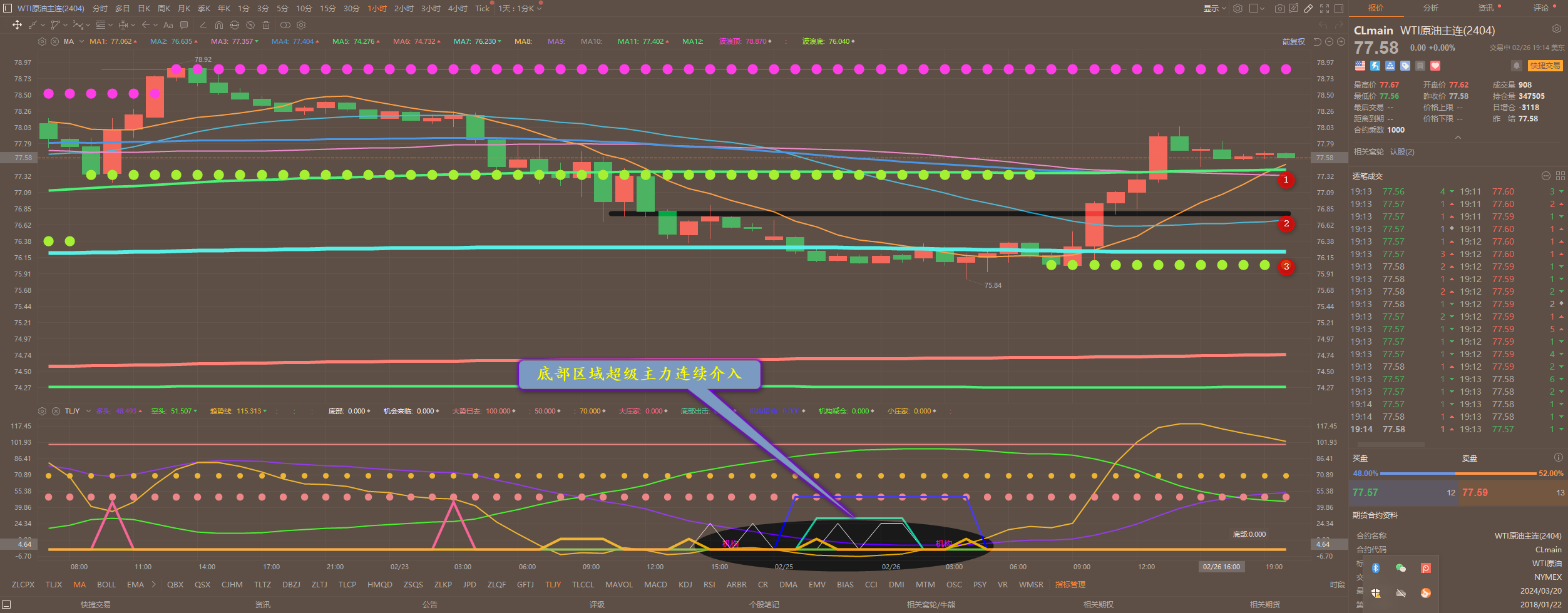 通过对原油小时图解析得知,昨日行情先跌后涨,如期在下方的75.80一线止跌反弹,我们从下方的附图可以清楚的看到在底部区域连续2次出现超级主力建仓的信号,从而导致行情晚间的反弹上涨继续回归上涨走势,短期下方我们重点关注12,3号的支撑,上方重点关注78.90一线的压制即可,短期在操作上我们继续重点逢低做多,具体建议如下: