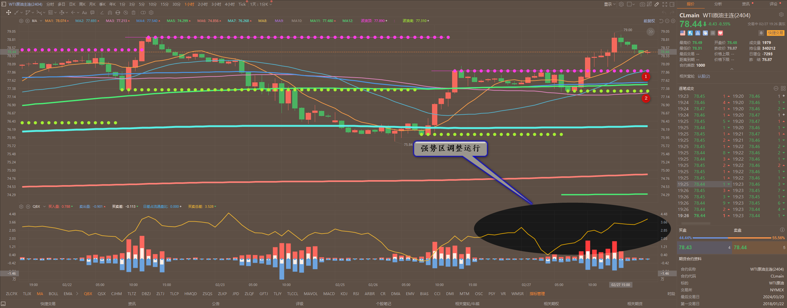 通过对原油小时图解析得知,昨日行情先跌后涨继续延续反弹上涨走势,晚间一度到达79一线,昨日就已经说过自从多头主力在75.80一线加仓以来行情急速拉升脱离底部区域,目前如期创新高,我们从下方的附图可以清楚的看到,昨日在回落调整的过程中多头主力再次不断的增仓进入,从而导致行情不断的上行突破,正如我们前期所说行情继续向上运行,短期在操作上我们继续高空低多思路重点逢低做多,具体建议如下: