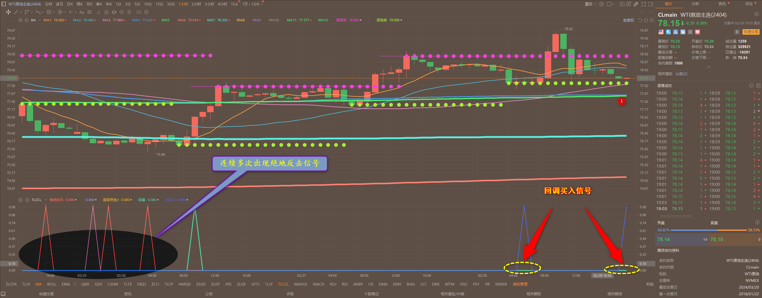 通过对原油小时图解析得知,昨日行情继续先跌后涨,突破创新高,我们从下方的附图可以清楚的看到在前期底部区域连续出现了绝地反击信号,从而导致行情的一路高歌,昨日在回落的低点位置出现回调买入信号晚间再次启动上涨行情并且放量突破创新高,今日再次回到下方78.10一线出现回调买入信号,但是不排除进一步回落调整到达下方1号均线的强支撑,短期在操作上我们继续重点逢低做多,具体建议如下: