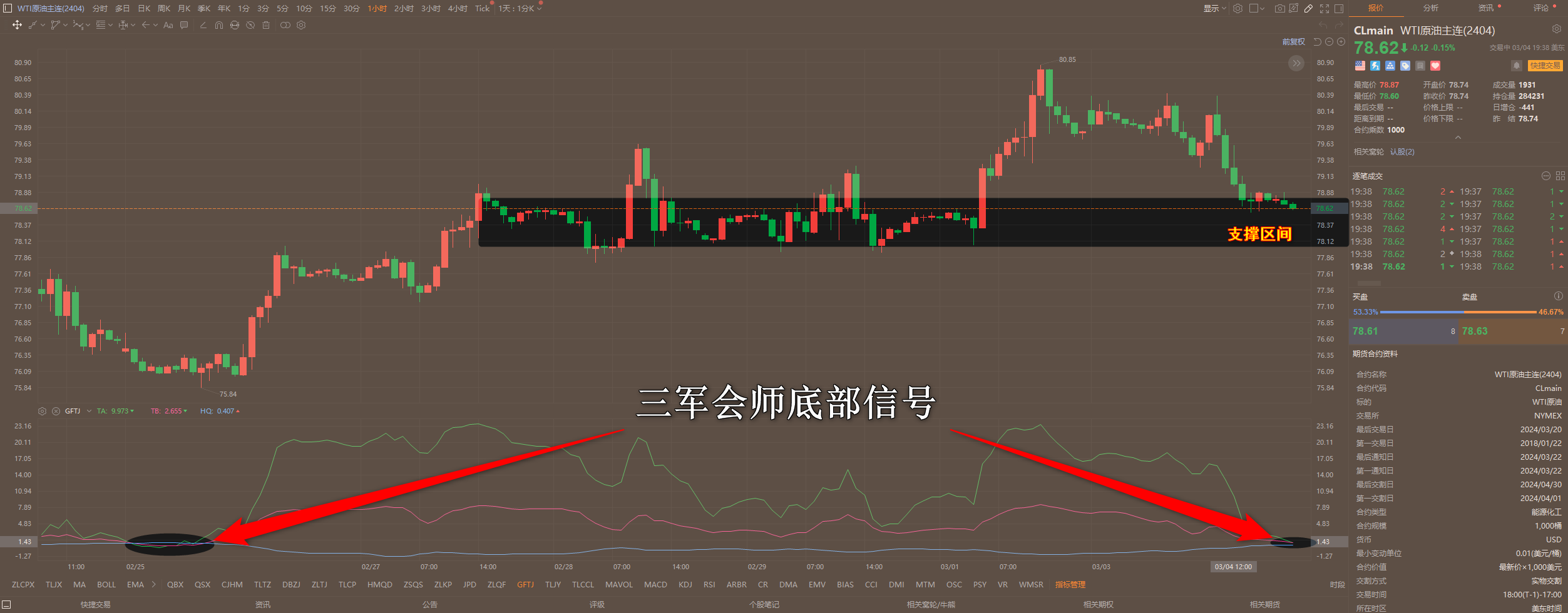 原油78.10和76.40分别做多,止损各70点,止盈各300点;