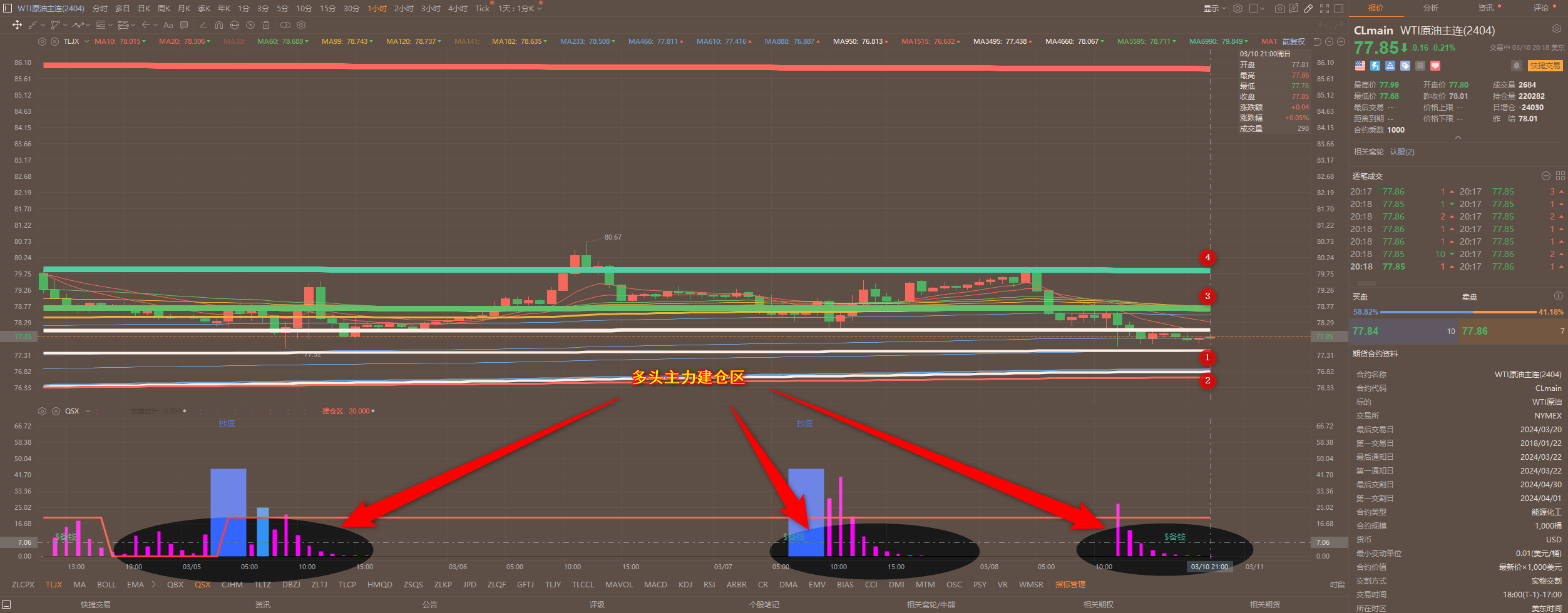 通过对原油小时图解析得知,上一个交易日反弹无力在4号均线压力位受阻回落,目前再次回到前期建仓的位置77.40一线今日早盘有所反弹,我们从下方的附图可以清楚地看到短期在下方再次出现多头主力建仓动作,近期已经连续3次在下方出现多头主力建仓动作,说明多头主力在蓄谋更大一波行情,但是也不排除进一步的下跌,短期下方我们重点关注12号的支撑位,上方我们重点关注34号均线的压力,在操作上忙完继续高空低多思路,具体建议如下: