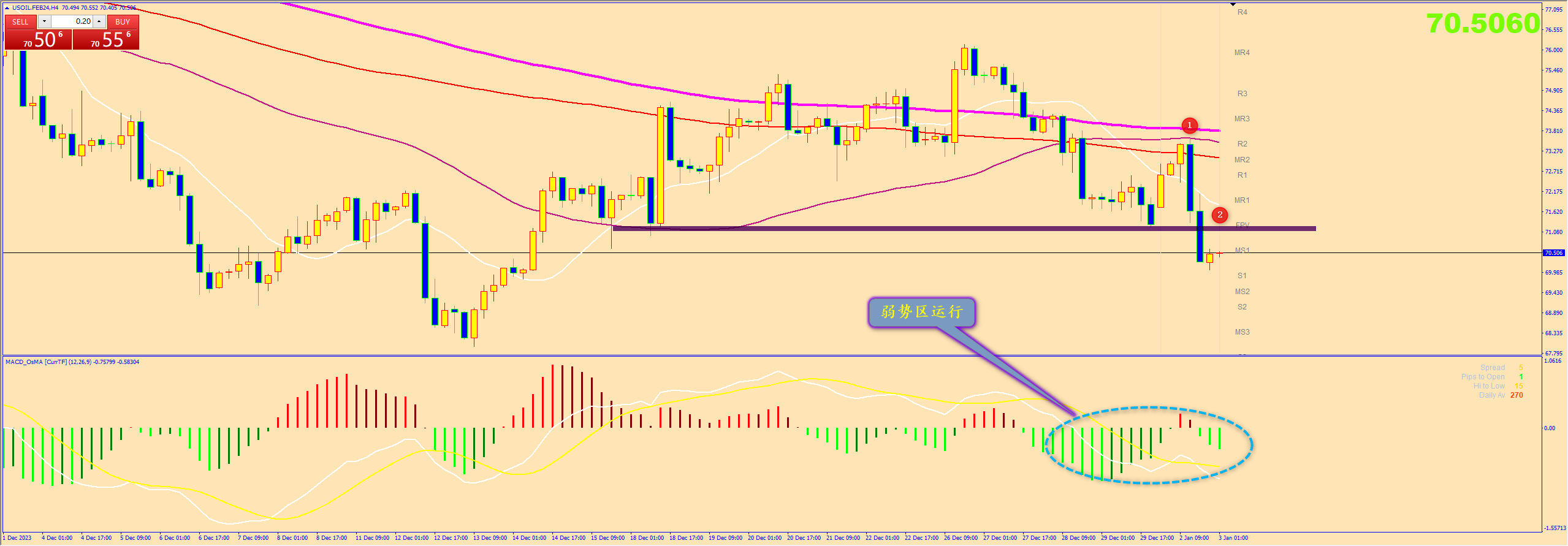 通过对黄金4小时图解析得知,黄金从早盘到目前为止继续窄幅震荡运行,从走势来看下方3号均线已经得到了有效的支撑,我们从下方的附图也可以清楚的看到目前在下方已经出现了大量的多头主力建仓动作说明已经到达阶段性底部区域,止跌反弹的可能性更加大一点,短期上方我们重点关注1,2号的压力即可,在操作上我们暂且先高