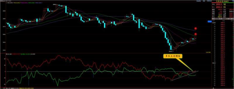 通过对黄金小时图解析得知,昨日行情先涨后跌,继续延续下跌走势,行情之所以会出现冲高回落动作我们从下方的附图可以清楚的看到在昨日反弹至上方2079一线出现了多头主力大量出逃迹象从而导致行情反弹无力,目前有所反弹,可以清楚的看到多头主力只是一部分资金进仓,预计将会继续横盘震荡调整运行以时间换空间,短期我