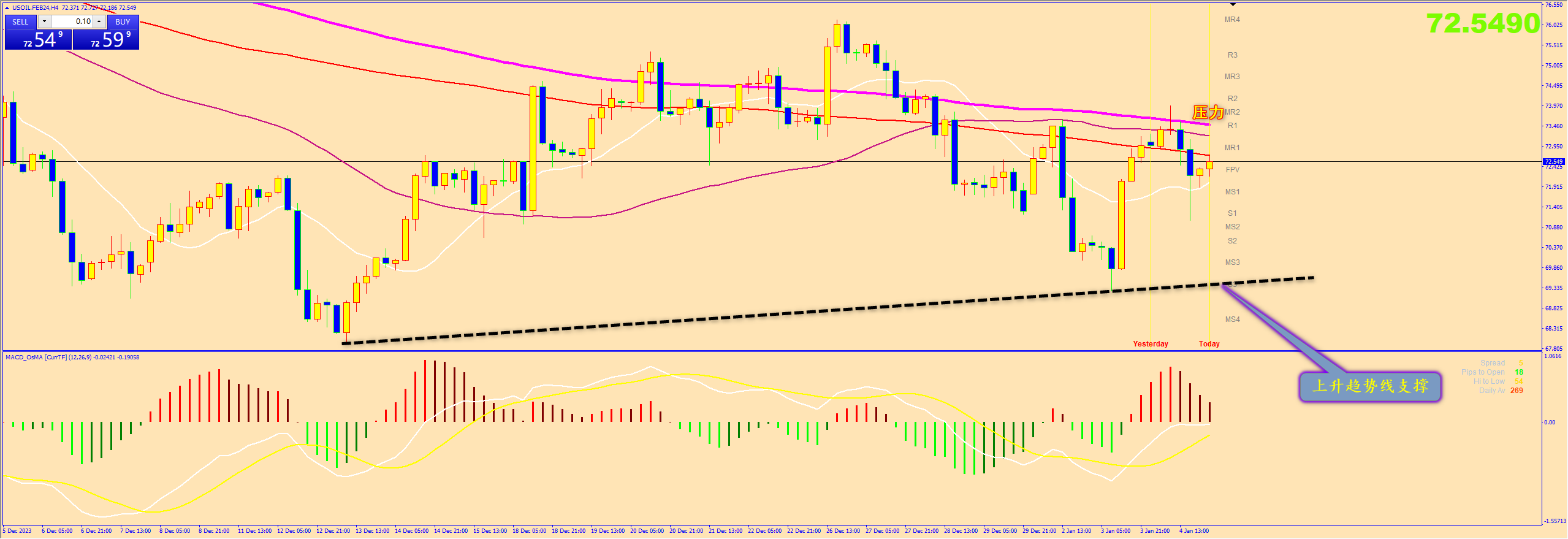 通过对原油4小时图解析得知,昨日行情先涨后跌如期再上方的均线压力位受阻回落,我们从下方的附图ACD可以清楚地看到目前整体依然是在零轴下方运行整体属于反弹阶段,短期上方均线的压制依然是短期重点关注的位置,下方我们重点关注上升趋势线的支撑,预计短期继续震荡盘整运行,在操作上我们继续高空低多思路,具体建议