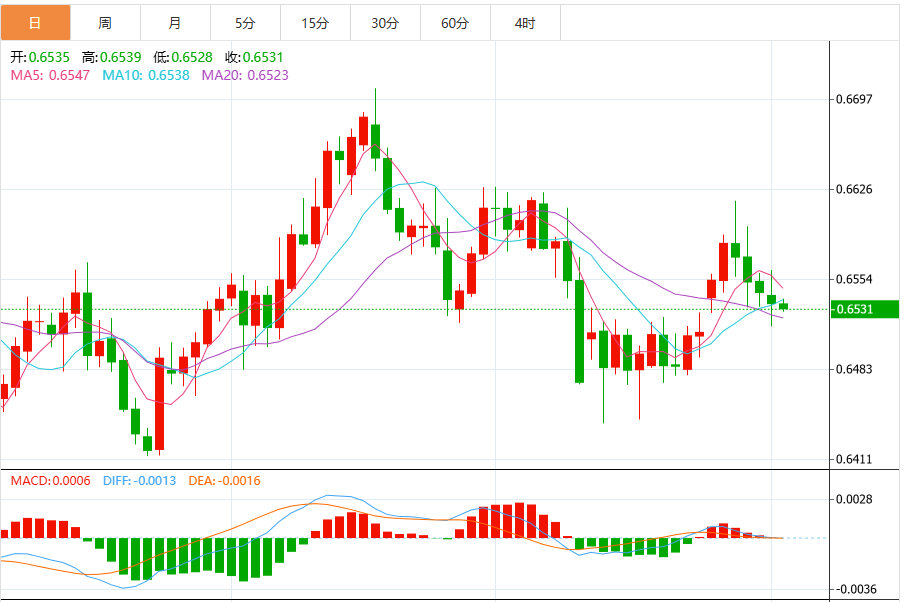 技术图显示,自0.6562一线高点回落后,汇价沿着短期下降通道震荡走低,最低探至0.6491。0.6500整数关口构成即时心理位,但上方0.6517的回撤高点已转化为短线阻力,若不能站稳其上,反弹多为技术性修复。