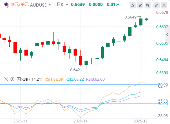 倘若中国公布的贸易数据优于市场预期,这将对澳元(AUD)形成有力的提振作用。从技术层面来看,澳元兑美元汇率的首个上行阻力位位于12月5日创下的高点0.6650。一旦突破这一关键点位,下一个阻力位将出现在9月16日的高点0.6688。若能继续上扬,汇率有望攀升至9月17日的高点0.6707。这几个关键点位,将成为市场观察澳元兑美元汇率能否持续走强的重要参照。