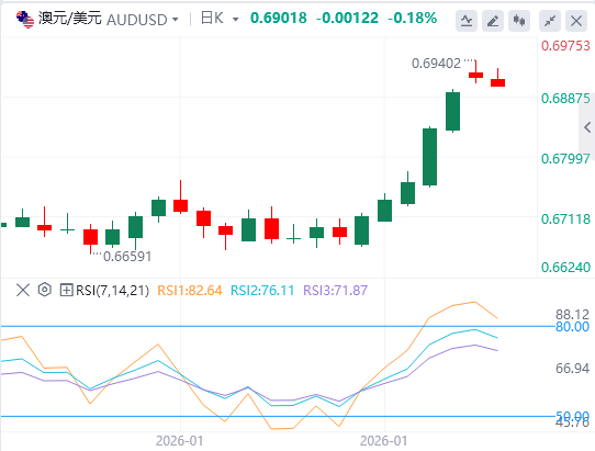 下行方面,主要支撑位于下方上升通道边界约0.6850,随后是九日均线0.6824。若跌破该汇合点,将削弱多头偏向,目标为50日均线0.6686。