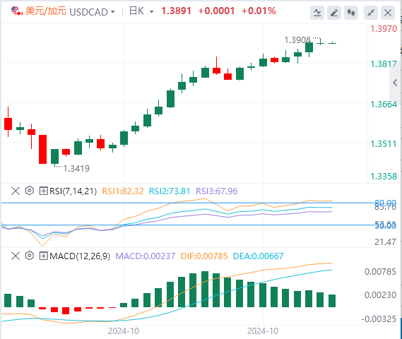 移动平均收敛散度(MACD)也显示出看涨前景,直方图上升并呈绿色。这表明买盘压力正在增加,并且该货币对的整体前景仍然乐观。然而,这些信号的超买性质为修正打开了大门。美元/加元应该会在1.3800和1.3900之间找到支撑,然后才会出现下一次看涨。