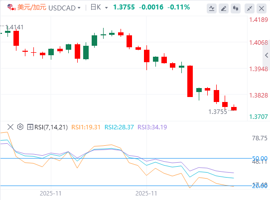 美元在美联储鸽派预期的基础下,继续表现相对不佳。事实上,美国央行预计2026年仅再降息一次。然而,美联储主席鲍威尔的言论削弱了明年可能更多降息的押注,这与普遍存在的风险偏好环境一起,持续削弱了避险美元的价值,并拖累美元兑加元汇率。
