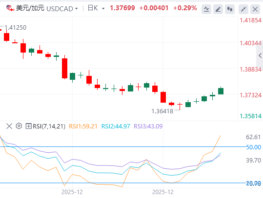 日线图中,美元/加元前景负面,价格跌破缓降的100日均线1.3877。布林带正在收窄,价格徘徊在1.3839上轨以下,反映出波动性减弱,上升动能稳定。RSI位于中线下方,约46.01,显示短期内有空跌动能。