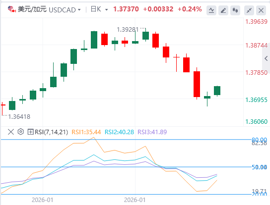 从1.3929高点测得到1.3671低点,23.6%的斐波那契回撤位1.3732作为附近的枢纽,而1.3770的38.2%则构成初始阻力。若继续突破后者,反弹可能延伸至100期限均线1.3832,而收盘价回落至1.3732以下则在更广泛的空跌情境下反弹风险较大。