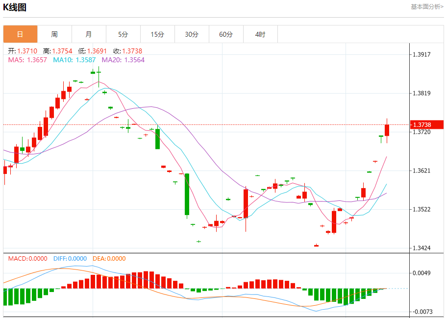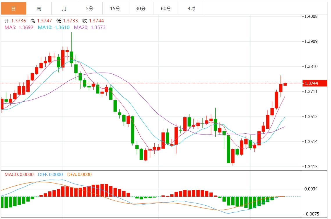 周四盘中,美元/加元报1.3727,涨幅0.12% 今日分析:在1.3685之上,看涨,目标价位为1.3730,然后为1.3750。 技术点评:在1.3685之上,为多头信号,向上的目标位为1.3730。 支撑位:1.37701.37501.3730 阻力位:1.36851.36701.3650 (亚汇网编辑:静香)