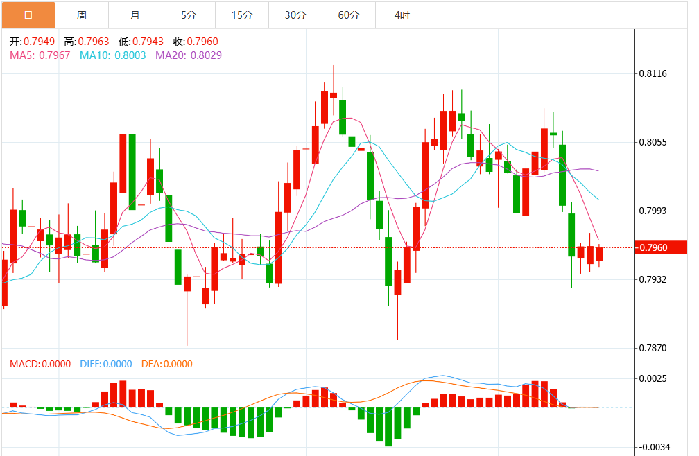 技术上,从日线图表来看,汇价近期经历了较为明显的回调过程,从0.8101的阶段高点持续下行,一度探及0.7923的低位,随后展开技术性反弹。当前汇价在0.7960附近获得一定支撑,但上方0.8000整数关口构成短期阻力。