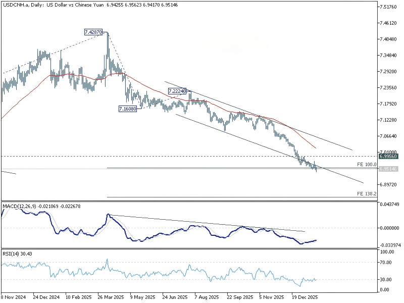 与此同时,美元兑人民币持续下跌,但下行势头明显减弱。日线MACD显示出看跌压力减弱,而该货币对难以突破下落通道底部和100%预测7.4287,从7.2224的6.9545升至7.1608。若从当前水平反弹并突破6.9956,将确认短期见底,并强化人民币强势受控而非无限期的观点。