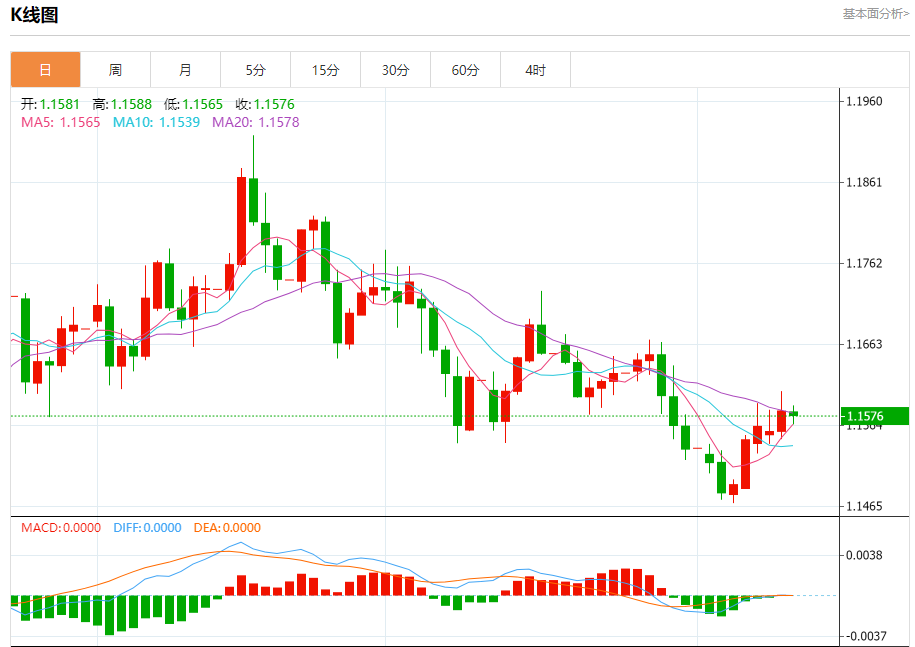 今日周三,截止目前欧元兑美元报1.1575,下跌0.06%。