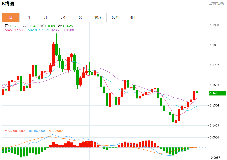 今日周五,截止目前欧元兑美元报1.1625,下跌0.07%。