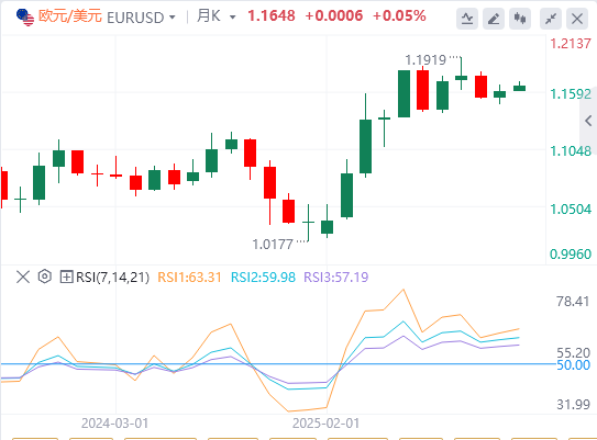 20期简单移动平均线(SMA)突破50、100和200期均线,所有坡度均向上,价格保持在上方。20SMA位于1.1646,提供附近的动态支撑。相对强弱指数(14)为59,保持中性至多头基调。