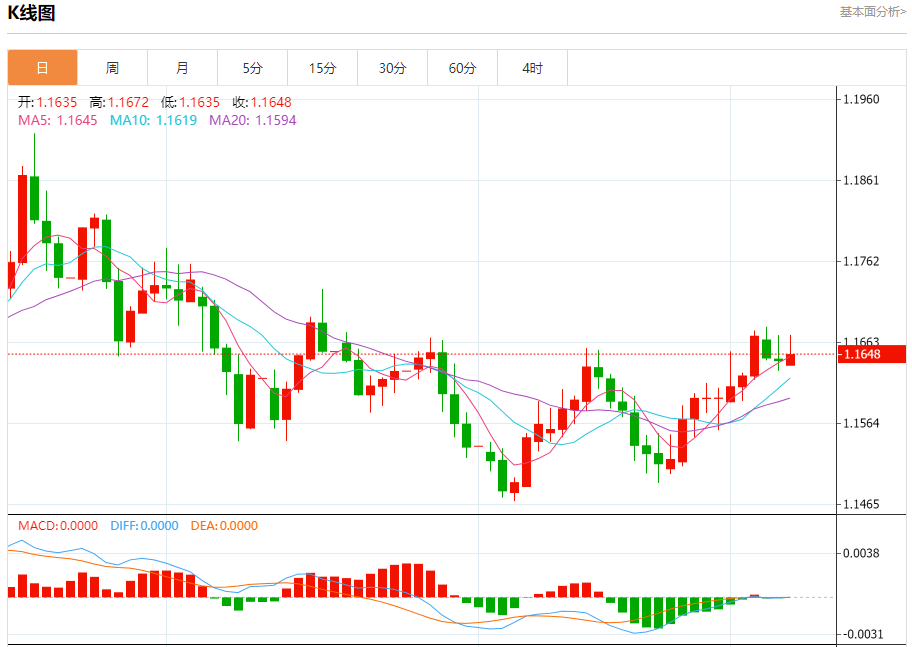 今日周一,截止目前欧元兑美元报1.1649,上涨0.05%。