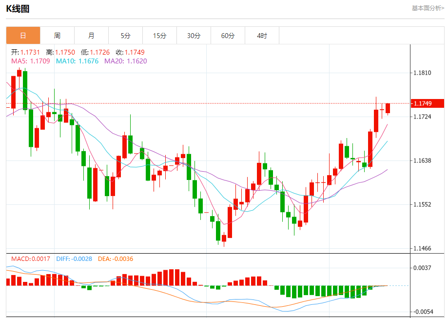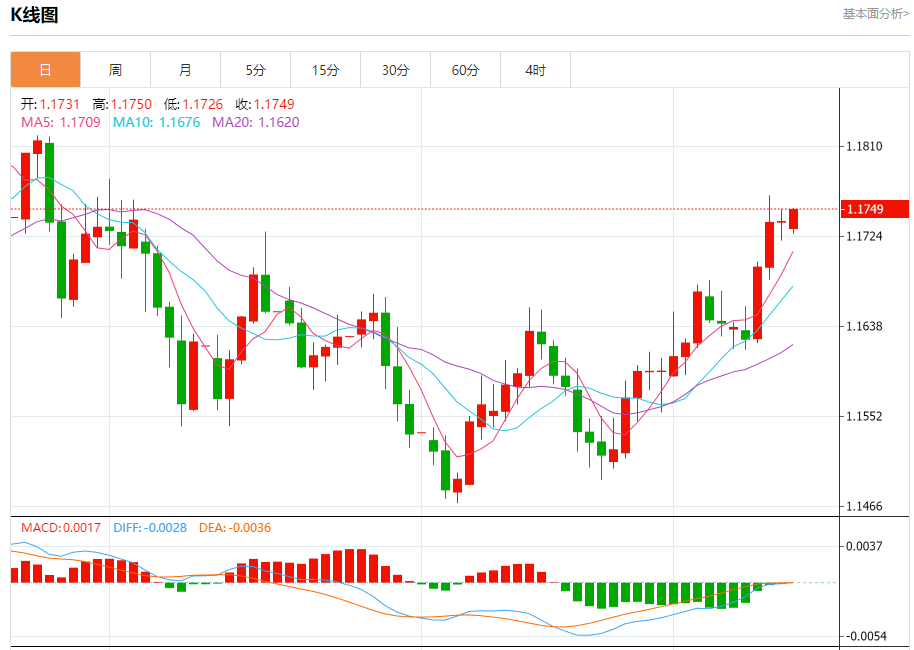 今日周一,截止目前欧元兑美元报1.1752,上涨0.11%。