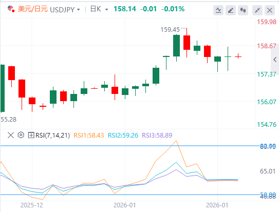 100期简单移动平均线(SMA)下行至158.17,美元兑日元汇率守在下方,保持盘中看跌倾向。若回升至该均线,将缓解下行压力。移动平均收敛背离(MACD)及其信号线集中在零点附近,平坦直方图表明动量有限。相对强弱指数(RSI)为48(中性),方向性优势有限。从159.46高点测得到157.41低点,38.2%斐波那契回撤位158.19,50%回撤位158.43,限制初期反弹。