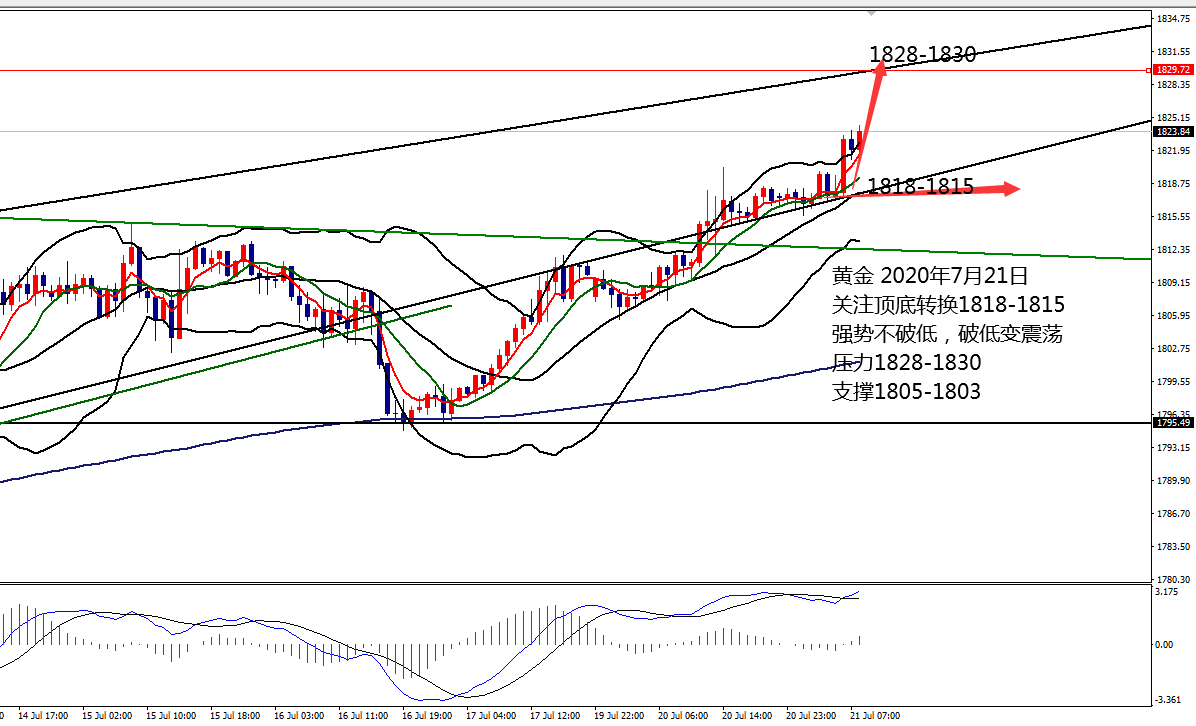 欧盘突破新高,日内低点1815.8作为分界线,参考顶底转换区域作为分界,以此分界,守住支撑向上攀升找寻1828-1830,跌回1818-1815区域,行情转为震荡,支撑1805-1803。