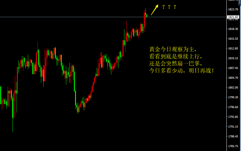 目前市场逻辑还是偏向于多头,所以短线看多黄金完全可以,但由于市场扭曲感还一直存在,所以校立就暂不做布局了,今日主要是观察,耐心看黄金到底继续慢牛上涨,还是会突然给出扇一巴掌,这一切都以观察为主,多看少动,明日再战!