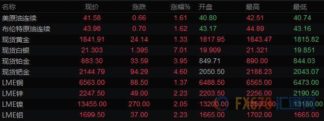 贵金属价格涨至多年高位,现货黄金一度大涨1.41%,刷新2011年9月以来高点至1843.47美元/盎司,现货白银涨逾7%,创2014年7月以来高点至21.321美元/盎司,创下四个月来最佳单日表现;因美元遭抛售,且市场预期刺激力度将加大以帮助遭受大流行打击的经济体复苏。