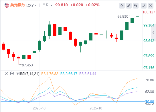 从技术面看,美元指数在10月突破了自2024年四季度形成的下行通道上轨,MACD指标在零轴上方形成金叉,显示多头力量占据优势。日线级别,美元指数在98.50-100.50区间内震荡,月内波动率提升至12%,较9月上升3个百分点,反映市场分歧加大。
