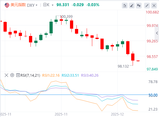 12月12日,周五亚市盘中,美元徘徊在98.33附近。
