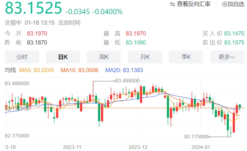 周五亚盘,美元小幅下跌,印度卢比获得动能。然而,由于美国经济数据向好,美国国债收益率上升,印度卢比上行空间可能会受到限制。此外,由于印度是全球第三大原油消费国,红海地缘政治紧张局势导致的油价反弹也可能对印度卢比构成压力。 市场走势:印度卢比在多重不利因素下维持脆弱 印度储备银行(RI)行长达斯(