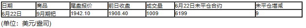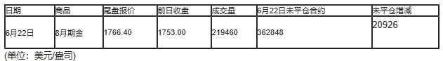截至北京时间04:59,6月22日纽约商品交易所(COX)8月期金成交量为219460,6月22日未平仓合约增加20926手。