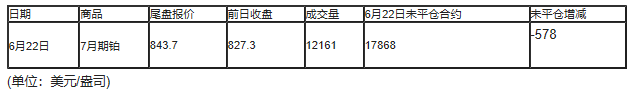 截至北京时间04:59,6月22日纽约商品交易所(NYX)2020年8月期铂成交量为12161,6月22日未平仓合约减少578手。