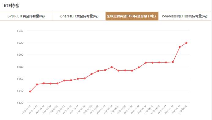 截至2020年6月22日,全球8大黄金TF持仓总量为1920.173吨,与上一交易日增加7.323吨。